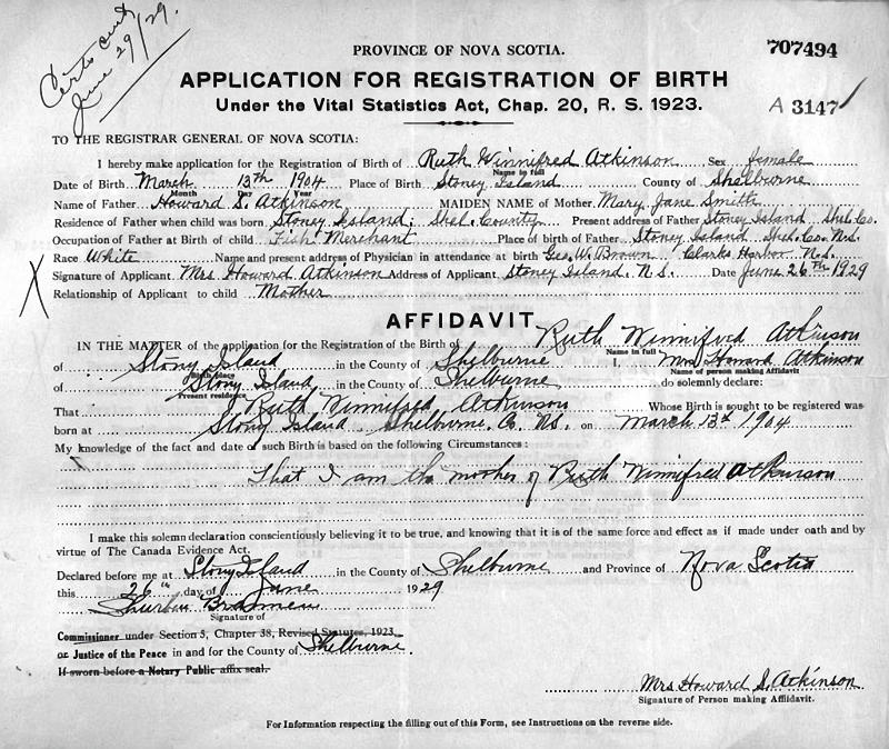 Parents Father: ATKINSON, Henry Howard Mother: SMITH, Mary Jane Birth Born on March 13, 1904 in Stoney Island, Shelburne Co., NS Death Died on 1984 in Rockland, Kings Co., NS Marriages SANFORD, Murray Emerson Married on November 26, 1921 in Berwick, Kings Co., NS Sources Mormons: https://www.familysearch.org/en/tree/person/details/LZDZ-K85 Images Ruth Atkinson Birth Murray Sanford Marriage