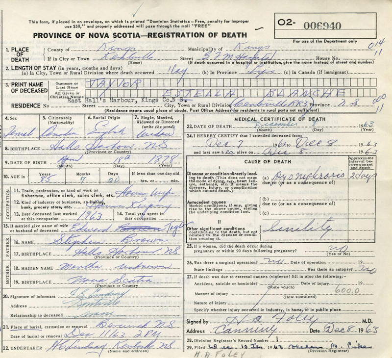 Birth Born on April 18, 1878 in East Halls Harbour, Kings Co., NS Death Died on December 08, 1963 in Kentville, Kings Co., NS Buried in Berwick Cemetery in Berwick, Kings Co., NS Marriages TAYLOR, Edward W. Married on November 07, 1900 in Kentville, Kings Co., NS Children TAYLOR, Mabel Gertrude: 1907 - 1987 Notes Death: Pyonephrosis Sources Nova Scotia Deaths: Year 1963 Pg. 6940 Images Edward & Estella (Brown) Taylor Estella (Brown) Taylor Death Edward Taylor Marriage2