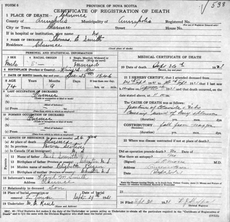 Birth Born on December 28, 1846 in Port Williams, Kings Co., NS Death Died on September 26, 1921 in Clarence, Annapolis Co., NS Buried in Fairview Cemetery in Lawrencetown, Annapolis Co., NS Marriages CLEMM, Ida Eugenia Married on December 19, 1894 in Berwick, Kings Co., NS Children SMITH, Floyd Murdock: August 09, 1896 - May 14, 1990 Notes Occupation: Yeoman/ Farmer Death: Fall from wagon fracturing ribs & clavicle Sources Nova Scotia Deaths: Book 52 Pg. 538 Annapolis Cemetery Records: Lawrencetown Fairview Cemetery #505 Images Thomas & Ida (Clemm) Smith Thomas Smith Death Thomas Smith Marriage