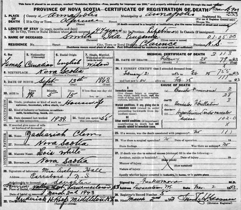 Birth Born on September 13, 1863 in Cornwallis, Kings Co., NS Death Died on February 28, 1943 in Clarence, Annapolis Co., NS Buried in Fairview Cemetery in Lawrencetown, Annapolis Co., NS Marriages SMITH, Thomas Ephraim Married on December 19, 1894 in Berwick, Kings Co., NS Children SMITH, Floyd Murdock: August 09, 1896 - May 14, 1990 Notes Death: Chronic Pneumonia Sources Nova Scotia Deaths: Book 202 Pg. 253 Annapolis Cemetery Records: Lawrencetown Fairview Cemetery #505 Images Thomas & Ida (Clemm) Smith Ida (Clemm) Smith Death Thomas Smith Marriage