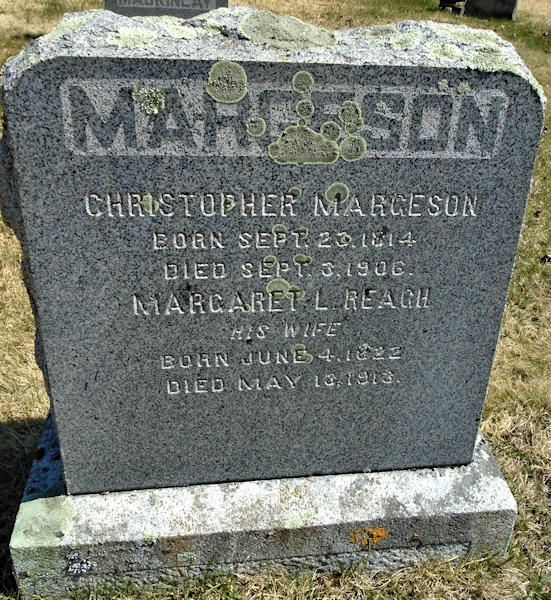 Birth Born on September 23, 1814 in Annapolis Royal, Annapolis Co., NS Death Died on September 03, 1906 in South Bridgetown, Annapolis Co., NS Buried in Berwick Cemetery in Berwick, Kings Co., NS Marriages REAGH, Margaret L. Children MARGESON, Caroline Ardelia: June 23, 1843 - December 02, 1921 Notes Occupation: Farmer Sources Kings Cemetery Records: Berwick Cemetery Images Christopher & Margaret (Reagh) Margeson
