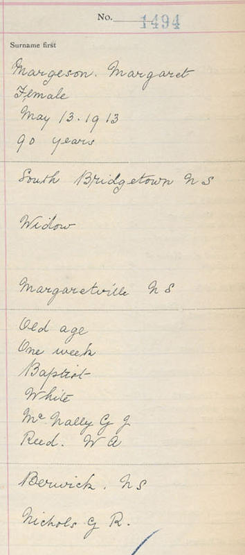 Birth Born on June 04, 1822 in Margaretsville, Annapolis Co., NS Death Died on May 13, 1913 in South Bridgetown, Annapolis Co., NS Buried in Berwick Cemetery in Berwick, Kings Co., NS Marriages MARGESON, Christopher Children MARGESON, Caroline Ardelia: June 23, 1843 - December 02, 1921 Notes Death: Old Age Sources Nova Scotia Deaths: Book 12 Pg. 244 #1494 Images Christopher & Margaret (Reagh) Margeson Margaret (Reagh) Margeson Death