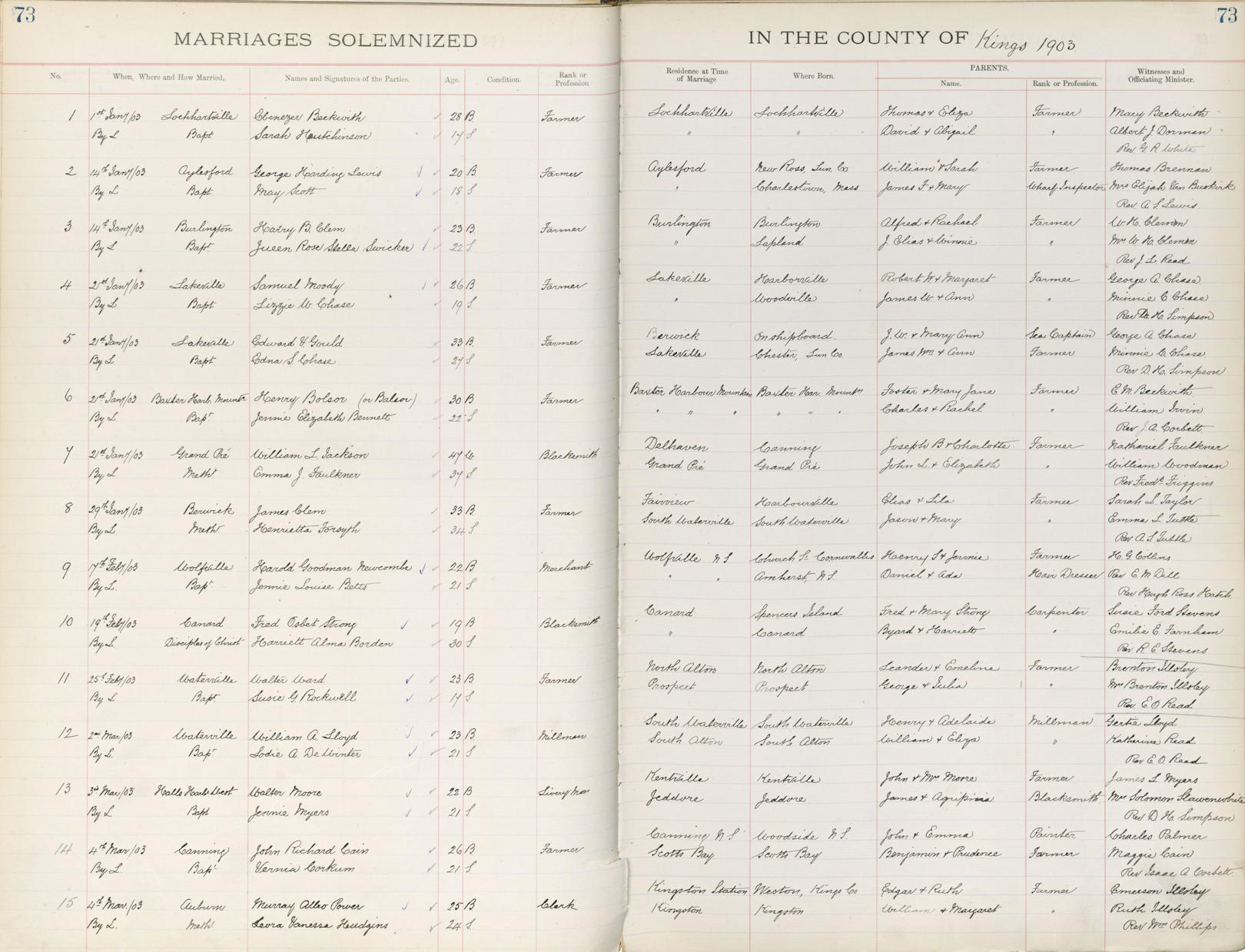 Birth Born on July 24, 1883 in Spencer's Island, Cumberland Co., NS Death Died on June 22, 1968 in Windsor, Hants Co., NS Buried in Jawbone Corner Cemetery in Canard, Kings Co., NS Marriages BORDEN, Harriet Alma Married on February 19, 1903 in Canard, Kings Co., NS Children STRONG, Hilda Maude: July 20, 1910 - July 10, 1935 Notes Occupation: Blacksmith - Farmer Death: Myocardial Failure Sources Nova Scotia Deaths: Year 1968 #4198 Images Fred Strong Death Fred Strong Marriage