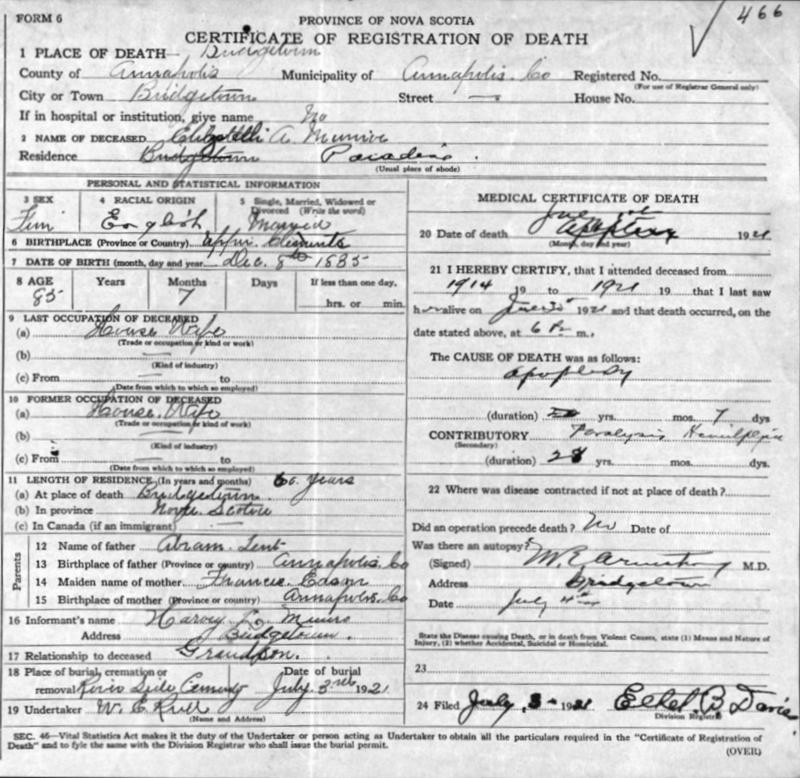 Birth Born on December 08, 1835 in Upper Clements, Annapolis Co., NS Death Died on July 01, 1921 in Bridgetown, Annapolis Co., NS Buried in Riverside Cemetery in Bridgetown, Annapolis Co., NS Marriages MUNRO, Daniel Married on January 10, 1860 in Clements, Annapolis Co., NS Children MUNRO, Mary Catherine: February 21, 1866 - September 17, 1942 Notes Death: Apoplexy Sources Nova Scotia Deaths: Book 52 Pg. 466 Images Elizabeth (Lent) Munro Death