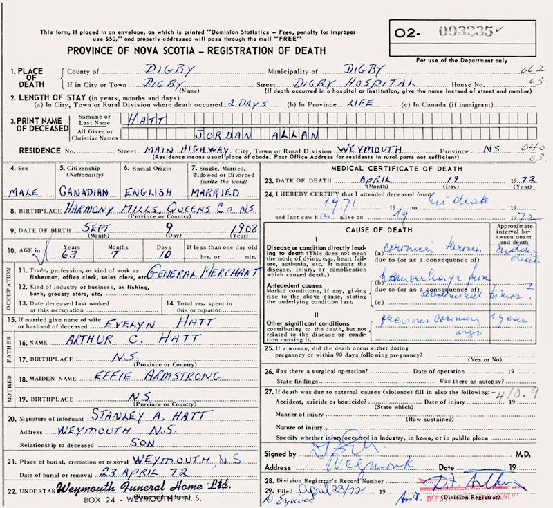 Parents Father: HATT, Arthur Crawley Mother: ARMSTRONG, Effie Flora Margaret Birth Born on September 09, 1908 in Harmony Mills, Queens Co., NS Death Died on April 19, 1972 in Digby, Digby Co., NS Buried in Weymouth Church of Christ Cemetery in Weymouth, Digby Co., NS Marriages WAGNER, Evelyn Ursula Married on October 22, 1927 in Weymouth, Digby Co., NS Children HATT, Stanley A. Notes Occupation: Clerk/ General Merchant Death: Coronary Thrombosis Sources Nova Scotia Deaths: Year 1972 #3235 Images Jordan Hatt Birth Jordan Hatt Death Jordan Hatt Marriage
