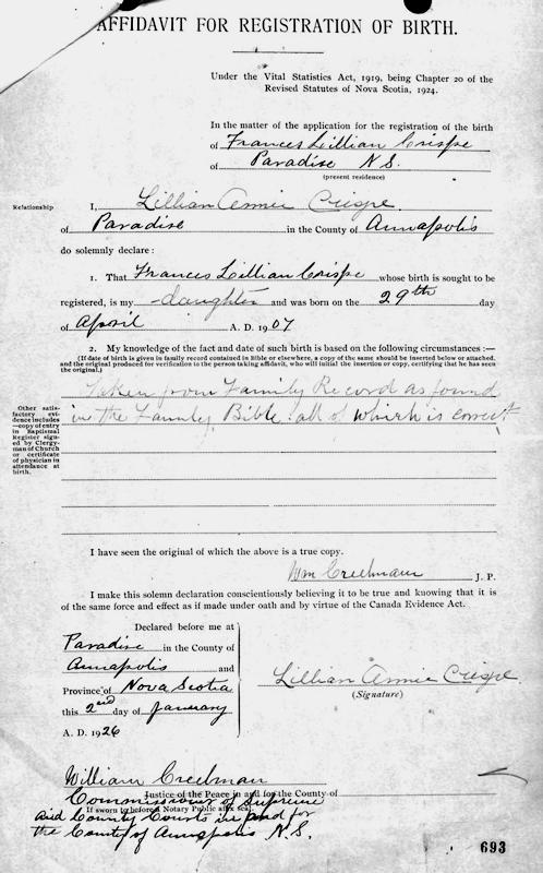 Parents Father: CRISPE, Charles Edward Mother: RUGGLES, Annie Lillian Birth Born on April 29, 1907 in Paradise, Annapolis Co., NS Images Frances Crispe Birth1 Frances Crispe Birth
