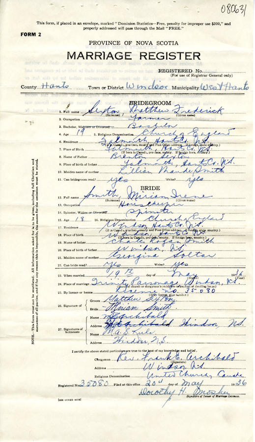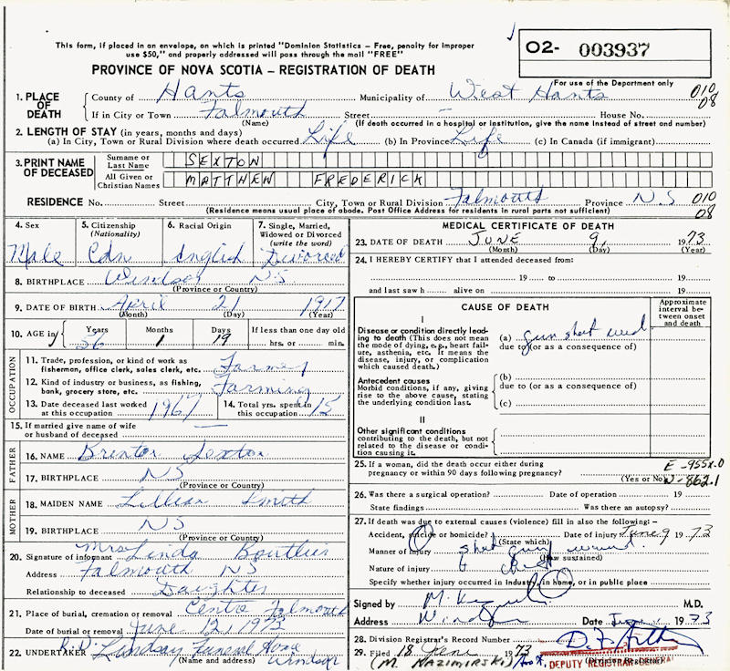 Parents Father: SEXTON, Brenton Albert Mother: SMITH, Lillian Maude Birth Born on April 21, 1917 in Falmouth, Hants Co., NS Death Died on June 09, 1973 in Falmouth, Hants Co., NS Buried in Falmouth Cemetery in Falmouth, Hants Co., NS Marriages SMITH, Miriam Irene Married on May 19, 1936 in Windsor, Hants Co., NS Divorced in 1954 Children SEXTON, Linda SEXTON, Lillian Joan: 1936 - January 26, 2010 Notes Occupation: Farmer Death: Suicide Gun Shot to Head Sources Nova Scotia Deaths: Year 1973 #3937 Images Matthew Sexton Birth Matthew Sexton Matthew Sexton Death Matthew Sexton Marriage