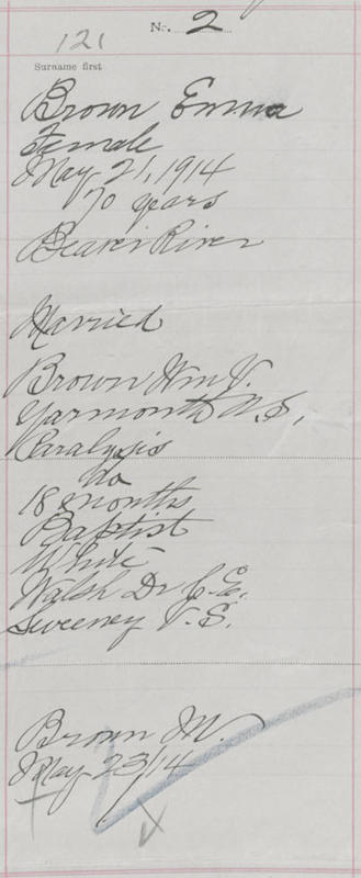 Birth Born on December 03, 1845 in Chebogue, Yarmouth Co., NS Death Died on May 21, 1914 in Beaver River, Yarmouth Co., NS Buried in Port Maitland & Beaver River Cemetery in Port Maitland, Yarmouth Co., NS Marriages BROWN, William Valentine Married on April 08, 1865 in Arcadia, Yarmouth Co., NS Children BROWN, Martha Wyman: February 11, 1874 - 1945 Sources Nova Scotia Deaths: Book 50 Pg. 35 #121 Images Emma (Wyman) Brown Death William Brown Marriage