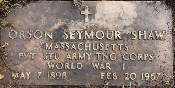 Parents Father: SHAW, John Leander Mother: YOUNG, Mary Matilda Birth Born on May 07, 1898 in Berwick, Kings Co., NS Death Died on February 20, 1967 in Nutley, Essex Co., NJ Buried in Dell Park Cemetery in Natick, Middlesex Co., MA Marriages TRAVIS, Mary Louise Married on November 23, 1921 in Manhattan, New York, NY Children SHAW, John S.: March 04, 1923 SHAW, Robert T.: June 10, 1924 - September 25, 2004 SHAW, Richard Payson: September 07, 1928 - April 14, 2010 Notes Military Service: WW1 US Army Sources Massachusetts Cemeteries: Dell Park Cemetery Natick,MA Images Orson Shaw