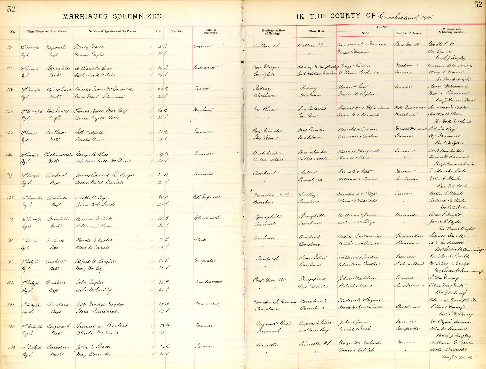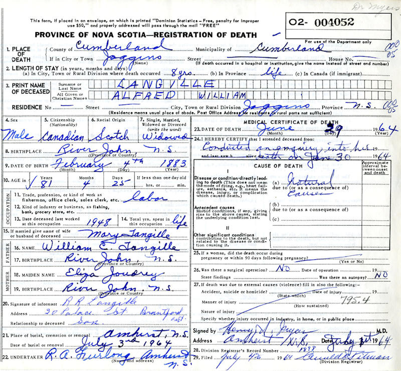 Parents Father: LANGILLE, William C. Mother: JOUDREY, Elizabeth Birth Born on February 24, 1883 in Denmark, Colchester Co., NS Death Died on June 29, 1964 in Joggins, Cumberland Co., NS Buried in Highland Cemetery in Amherst, Cumberland Co., NS Marriages MACDONALD, Isabella Elizabeth (Noiles) Married on December 01, 1934 in Amherst, Cumberland Co., NS McKAY, Mary Elizabeth Married on July 01, 1906 in Amherst, Cumberland Co., NS Children LANGILLE, Effie Alberta: July 15, 1905 - May 04, 1974 LANGILLE, Constance: 1909 LANGILLE, Lillian Mary: June 27, 1909 - March 23, 1972 LANGILLE, Lottea: July 04, 1912 - March 15, 1999 LANGILLE, Jessie E.: May 05, 1914 LANGILLE, Hilda Grace: August 15, 1916 - June 30, 2005 LANGILLE, Robert Rayol: September 02, 1918 - April 30, 1996 Notes Occupation: Carpenter/ Car Builder/ Teamster Obituary: The death occurred suddenly early Tuesday of Alfred W. Langille of Joggins, formerly of Amherst. He had not been ill prior to his passing. He was 81 years of age, son of the late Mr. and Mrs. William C. Langille of Amherst. He was born in River John and had resided in Joggins for the past eight years. Before that he had spent most of his life in Amherst. He was a member of the Army in World War One. He was employed for over twenty years with the late W.A. Fillmore of Amherst. He was predeceased by his wife, the former Mary MacKay in 1924. Surviving are five daughters: Effie (Mrs. Blair Arsneault) of Brantford, Ont; Lillian (Mrs. Joseph Gould) and Hilda (Mrs. Basil Murphy) both of Toronto; Jessie (Mrs. William O'Heran) of Joggins and Lottie (Mrs. Arthur McDonald) of Amherst; one son Robert of Brantford, Ont, two sisters, Mrs. Herb Patterson of Amherst and Mrs. Stanley Coates of Montreal; also 21 grandchildren and 16 great-grandchildren. The late Mr. Langille is resting at Furlong's Funeral Home from which place the funeral wil be held this Friday afternoon at 2:30 o'clock conducted by Rev. Dr. W. J. MacDonald. Interment will be in the family lot at Highland Cemetery Military Service: WW1 Royal Canadian Army Death: Natural Causes Sources Nova Scotia Deaths: Year 1964 Pg. 4052 Images Alfred W. Langille Death Alfred W. Langille Marriage
