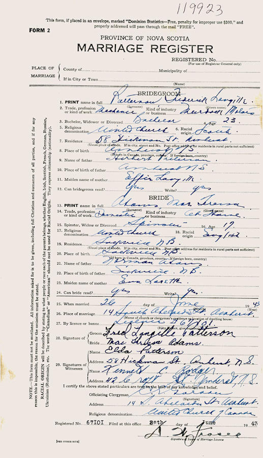 Parents Father: PATTERSON, Herbert Allan Mother: LANGILLE, Effie Elversa Birth Born on April 13, 1914 in Amherst, Cumberland Co., NS Death Died on May 27, 1914 in Amherst, Cumberland Co., NS Buried in Highland View Cemetery in Amherst, Cumberland Co., NS Notes Death: Pneumonia Sources Nova Scotia Deaths: Book 41 Pg. 42 #168 Images Jennie Patterson Birth Jennie Patterson Death Frederick Patterson Marriage
