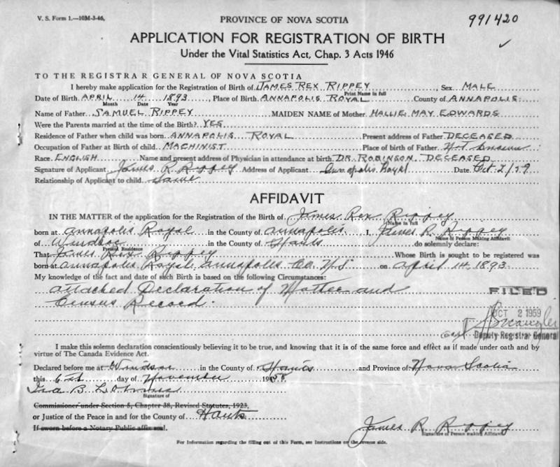 Birth Born on April 14, 1893 in Annapolis Royal, Annapolis Co., NS Death Died on February 05, 1976 in Halifax, Halifax Regional Municipality, NS Buried in Woodlawn Cemetery in Lequille, Annapolis Co., NS Marriages SULIS, Alice May Married on March 21, 1922 in Digby, Digby Co., NS Children RIPPEY, James Albert: October 10, 1927 - February 04, 2009 Notes Occupation: Electrician/ Town Clerk Obituary: ames Rippey, 83, formerly of Dartmouth, died Thursday, February 5th, at St Vincent's Guest House, Halifax. He was born in Annapolis Royal, a son of the late Samuel and Hallie (Edwards) Rippey. He was a past member of the Windsor Gyro Club, honorary member of the Windsor Fire Department, and justice of the peace. He was town clerk of Berwick for 6 years and of Windsor for 33 years, retiring in 1958. He leaves his wife, the former Alice Mae Sulis; 2 sons: James, Windsor; Samuel, Toronto; 4 daughters: Gladys, Mrs H Newkirk, Little Harbor; Joyce, Mrs S Jewers, Dartmouth; Marian, Mrs H McQuade, and Jean, both of Toronto; 2 sisters: Joyce, Mrs H McDaniel, Stellarton, and Margaret, Annapolis Royal; 13 grandchildren; 2 great grandchildren. Funeral was in Windsor United Church followed by interment in Woodlawn Cemetery, Annapolis Royal. Annapolis Spectator Annapolis Royal,NS March 3,1976 Images James R. Rippey Birth James & Alice (Sulis) Rippey James R. Rippey Marriage