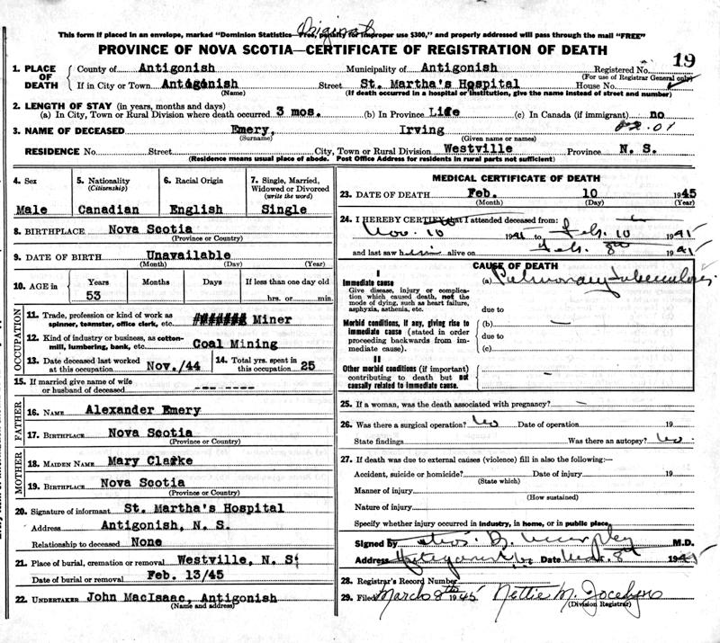 Parents Father: EMERY, Alexander Mother: CLARK, Mary Ann Birth Born on April 26, 1891 in Westville, Pictou Co., NS Death Died on February 10, 1945 in Antigonish, Antigonish Co., NS Buried in Westville, Pictou Co., NS Marriages JOUDRIE, Gladys Married on September 05, 1919 in Truro, Colchester Co., NS Notes Occupation: Steelworker/ Coal Miner Death: Pulmonary Tuberculosis Sources Nova Scotia Deaths: Book 221 Pg. 19 Images Irving Emery Death Gladys Joudrie Marriage