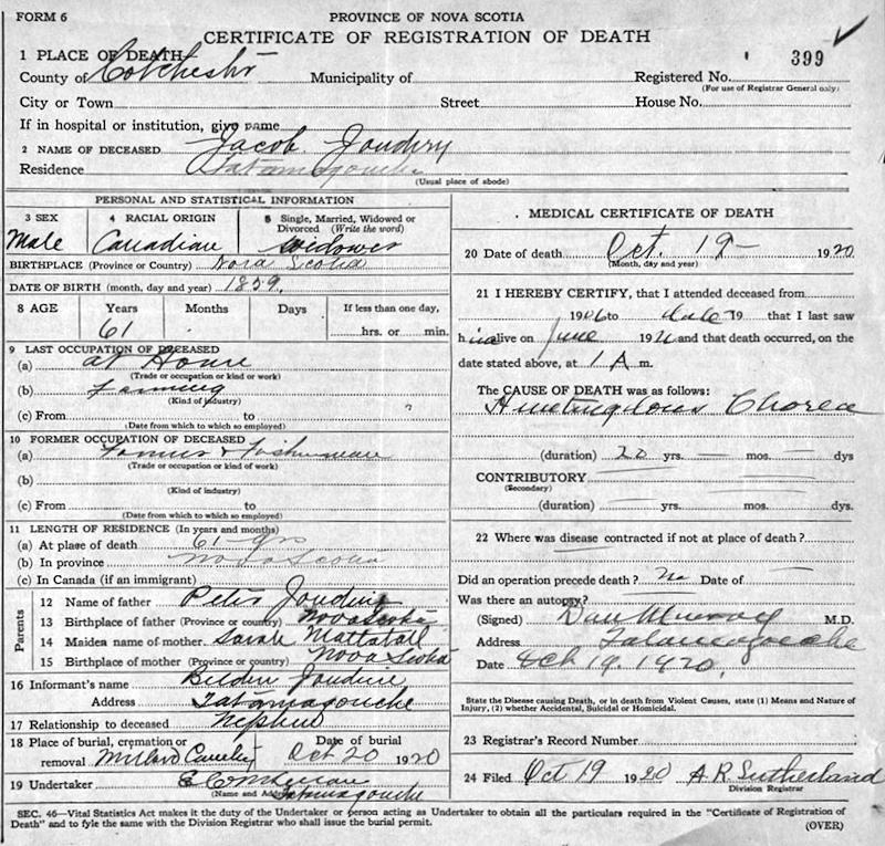 Parents Father: JOUDRIE, Peter Mother: MATTATALL, Sarah Jane Birth Born on April 01, 1856 in Brule, Colchester Co., NS Death Died on October 19, 1920 in Tatamagouche, Colchester Co., NS Marriages LANGILLE, Mary McBurnie Married on August 02, 1899 in River John, Pictou Co., NS SHEA, Jessie May Married on October 07, 1891 in River John, Pictou Co., NS Notes Occupation: Farmer Death: Huntington's Disease Sources Nova Scotia Deaths: Year 1920 File 61 #399 Images Jacob Joudrie Death Mary (Langille) Joudrie Marriage
