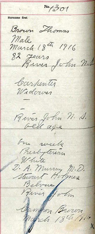 Birth Born on October 12, 1833 in River John, Pictou Co., NS Death Died on March 18, 1916 in River John, Pictou Co., NS Buried in Bellevue Cemetery in River John, Pictou Co., NS Marriages LANGILLE, Mary Ann Children BROWN, Cameron: May 16, 1874 - March 16, 1929 Notes Occupation: Ship Carpenter Death: Old Age Sources Nova Scotia Deaths: Book 44 Pg. 358 #1301 Images Thomas Brown Death