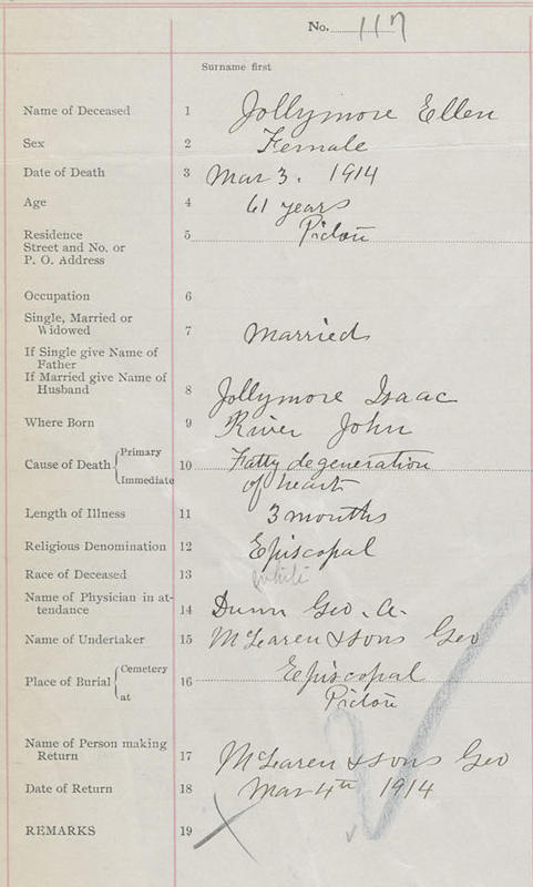 Birth Born on September 01, 1854 in River John, Pictou Co., NS Death Died on March 03, 1914 in Pictou, Pictou Co., NS Buried in Saint James Cemetery in Pictou, Pictou Co., NS Marriages JOLLYMORE, Isaac Married on February 29, 1872 in River John, Pictou Co., NS Children JOLLYMORE, Harry Havelock: August 02, 1885 - April 19, 1923 Notes Death: Fatty Degeneration of Heart Sources Nova Scotia Deaths: Book 44 Pg. 34 #117 Images Ellen (Heighton) Jollymore Death Isaac Jollymore Marriage