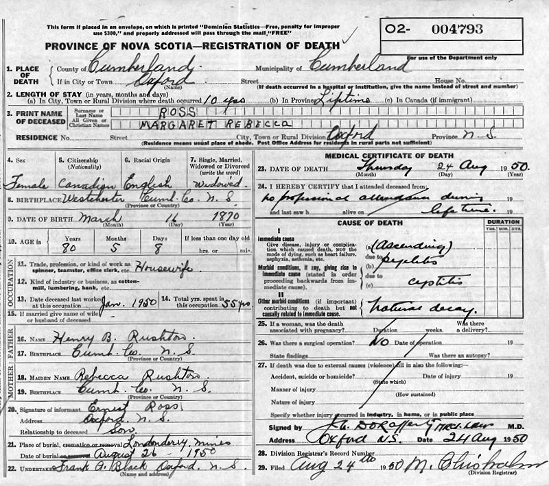 Birth Born on March 17, 1870 in Westchester, Cumberland Co., NS Death Died on August 24, 1950 in Oxford, Cumberland Co., NS Buried in Londonderry Mines, Colchester Co., NS Marriages ROSS, Robert Nichols Married on March 18, 1896 in Acadia Mines, Colchester Co., NS Children ROSS, Harry Lester: May 24, 1906 - May 21, 1970 Notes Death: Pyelitis Sources Nova Scotia Deaths: Year 1950 Pg. 4793 Images Margaret (Rushton) Ross Death Robert Ross Marriage