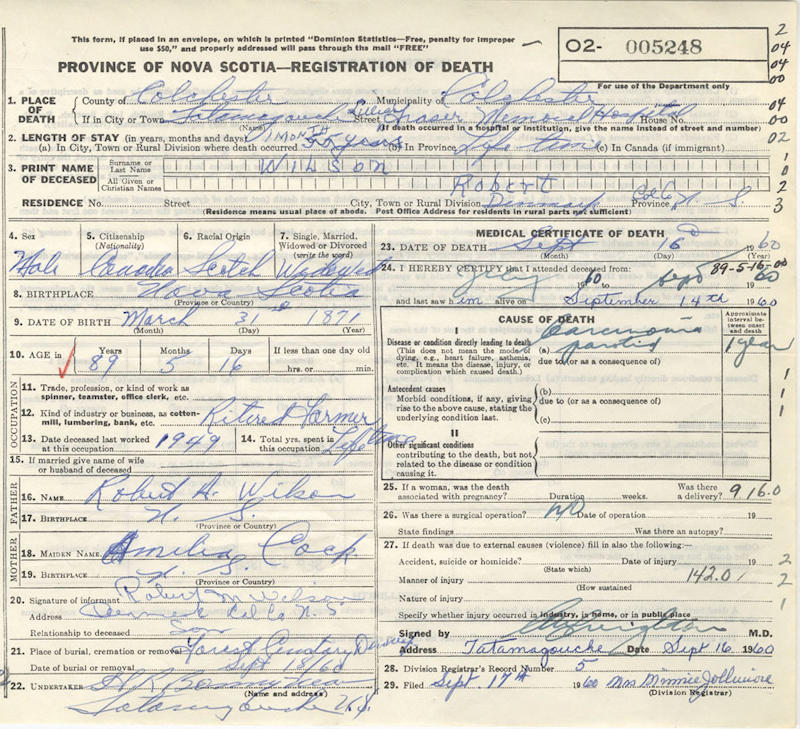 Birth Born on March 31, 1871 in New Annan, Colchester Co., NS Death Died on September 16, 1960 in Tatamagouche, Colchester Co., NS Buried in Forest Hill Cemtery in Denmark, Colchester Co., NS Marriages MACIVER, Annabelle Married on March 28, 1900 in Newton Centre, Middlesex Co., MA Children WILSON, Robert MacIvor: February 16, 1901 - January 11, 1987 Notes Occupation: Driver/ Farmer Death: Cancer Sources Nova Scotia Deaths: Year 1960 Pg. 5248 Colchester Cemeteries: Forest Hill Cemetery Denmark,NS #75 Images Robert C. Wilson Birth Robert C. & Annabelle (McIver) Wilson Robert C. Wilson Death Robert C. Wilson Marriage