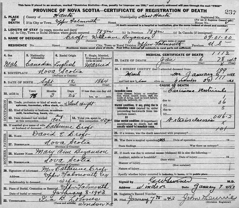 Birth Born on September 12, 1864 in Chester, Lunenburg Co., NS Death Died on January 06, 1943 in Upper Falmouth, Hants Co., NS Buried in St. George's Anglican Church Cemetery in Upper Falmouth, Hants Co., NS Marriages SANGSTER, Catherine Margaret Married on June 10, 1891 in Falmouth, Hants Co., NS Children CROFT, James Whitman: April 13, 1892 - October 13, 1962 CROFT, Maude Alice: January 10, 1895 - November 03, 1932 Notes Occupation: Wheelwright/ Carpenter Death: Carcinoma Ventriculs Sources Nova Scotia Deaths: Book 206 Pg. 237 Images William & Catherine (Sangster) Croft William Croft Death William Croft Marriage