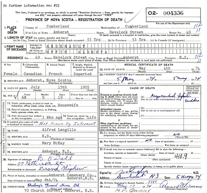 Parents Father: LANGILLE, Alfred William Mother: McKAY, Mary Elizabeth Birth Born on July 15, 1905 in Amherst, Cumberland Co., NS Death Died on May 04, 1974 in Amherst, Cumberland Co., NS Buried in Amherst Cemetery in Amherst, Cumberland Co., NS Marriages ARSENAULT, Blair Leonard Married on December 22, 1927 in Amherst, Cumberland Co., NS Notes Death: Myocardial Infarction Sources Nova Scotia Deaths: Year 1974 #4336 Images Effie (Langille) Arsenault Death Effie Langille Marriage