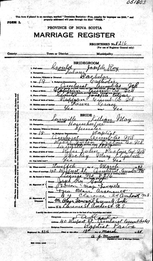 Parents Father: LANGILLE, Alfred William Mother: McKAY, Mary Elizabeth Birth Born on June 27, 1909 in Amherst, Cumberland Co., NS Death Died on March 23, 1972 in Amherst, Cumberland Co., NS Buried in St. Charles Cemetery in Amherst, Cumberland Co., NS Marriages GOULD, Joseph Roy Married on March 12, 1928 in Amherst, Cumberland Co., NS Children GOULD, Alfred R.: 1931 - 1967 Notes Death: Suprarenal Failure Sources Nova Scotia Deaths: Year 1972 #2841 Images Joseph R. & Lillian (Langille) & Alfred Gould Joseph R. & Lillian (Langille) Gould & Alfred Gould Lillian (Langille) Gould Death Lillian Langille Marriage