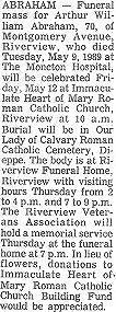 Parents Father: ABRAHAM, Arthur William Mother: SHIELDS, Alicia Veronica Birth Born on April 20, 1919 in Halifax, Halifax Regional Municipality, NS Death Died on May 08, 1989 in Moncton, Westmorland Co., NB Marriages SWIM, Florence Bella Married on October 08, 1943 in Saint John, Saint John Co., NB Children ABRAHAM, Patricia Ann Clare: 1944 ABRAHAM, Arthur Joseph: June 02, 1946 - July 18, 2013 Notes Occupation: Commercial Salesman Military Service: WW2 RC Army Images Arthur W. Abraham Birth Arthur W. Abraham Marriage Arthur W. Abraham Obit