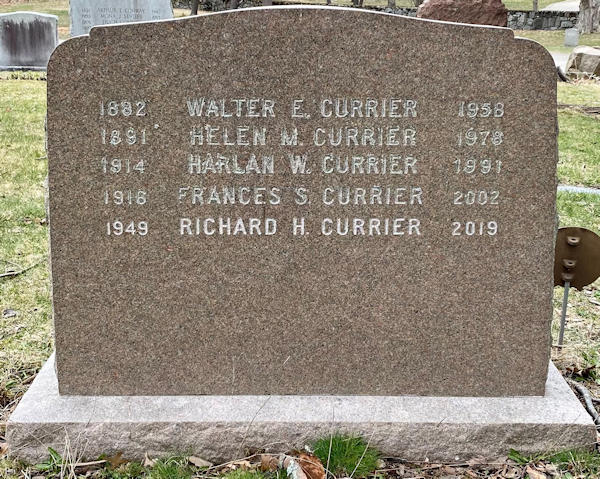 Parents Father: PHINNEY, Ingram Bell Mother: NEILY, Ada May Birth Born on January 13, 1891 in Somerville, Middlesex Co., MA Death Died on November 01, 1978 in Braintree, Norfolk Co., MA Buried in Milton Cemetery in Milton, Norfolk Co., MA Marriages CURRIER, Walter Enos Married on July 23, 1913 in Somerville, Middlesex Co., MA Children CURRIER, Harlan Walter: May 20, 1914 - July 14, 1991 CURRIER, Donald Robert: September 15, 1918 - January 07, 2010 Notes Occupation: Bookkeeper Sources Massachusetts Deaths: #049683 Images Helen Mae Phinney Birth Walter & Helen (Phinney) Currier & Harlan & Frances (Smith) & Richard Currier Helen Mae Phinney Marriage