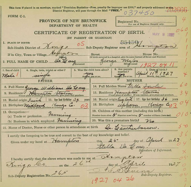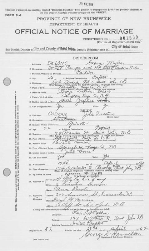 Parents Father: DELONG, George William Mother: FOWLER, Estella Josephine Birth Born on April 11, 1927 in Hampton, Kings Co., NB Death Died on September 29, 2009 in St. Stephen, Charlotte Co., NB Buried in Midland Cemetery in Midland, Kings Co., NB Marriages COSMAN, Julia Ernestine Married on April 10, 1954 in Saint John, Saint John Co., NB Children DELONG, Beverly DELONG, Leslie-Jo DELONG, Blaine Myles: 1957 Notes Obituary: DELONG, G. MYLES - The death of G. Myles DeLong of St. Stephen occurred on Tuesday, September 29th at his home surrounded by family and friends. Born in Hampton, NB on April 11, 1927, he was the son of the late George and Estella (Fowler) DeLong of Penobsquis, NB. Myles was a Forest Ranger with the New Brunswick Department of Natural Resources for 40 yrs until his retirement in 1987. He is survived by his wife of 55 years, J. Ernestine (Cosman) DeLong; his three children, Blaine (Mary Lou) DeLong of St. Stephen, Bev (Mike) Cavanagh of Saint John, and Leslie-Jo (Brian) Melanson of Moncton; his beloved grandchildren Zac & Garrett DeLong, Jesse Melanson, Carter & Charlie Cavanagh; his sister, Mary Powers of Moncton; his brothers, John (Helen) of Halifax and David (Marilyn) of Medicine Hat, AB; and by many nieces and nephews. Besides his parents, Myles was predeceased by his grandson, Cameron Cavanagh; and by brothers, Gordon, Bill, and Don. Visitation will be held at Humphrey's Funeral Home in St. Stephen 20 Marks Street (506 - 466 - 3110) on Thursday from 2 to 4 pm and from 7 to 9 pm. Funeral service will be held at 2 pm on Friday October 2 at Union St. Atlantic Baptist Church with Rev Dr. Garth Williams officiating. Interment will take place at the Midland Cemetery in Midland, NB on Saturday October 3 at 11 am. In lieu of flowers, memorial donations to Union St Church building fund are appreciated by the family. [Saint John Telegraph Journal - Saint John, NB, obit. publication date Oct 4, 2009] Occupation: Forest Ranger Sources Findagrave.com: http://www.findagrave.com/cgi-bin/fg.cgi?page=gr&GRid=98200607 Images George M. Delong Birth George M. Delong Marriage