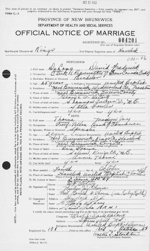 Parents Father: DELONG, George William Mother: FOWLER, Estella Josephine Birth Born on 1933 in Wickham, Queens Co., NB Marriages THORNE, Marilyn Joy Married on October 04, 1958 in Havelock, Kings Co., NB Notes Occupation: Clerk Trans Canada Credit Images David Delong Marriage