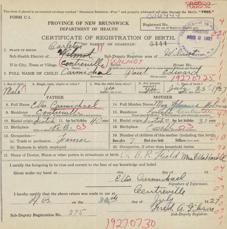 Birth Born on July 25, 1927 in Wilmot, Carleton Co., NB Death Died on April 17, 2017 in Woodstock, Carleton Co., NB Buried in Williamstown Cemetery in Bradley Corner, Carleton Co., NB Marriages McAULEY, Jean Marie Married on March 31, 1948 in Williamstown, Carleton Co., NB Children CARMICHAEL, Sandra CARMICHAEL, Raymond CARMICHAEL, Allen Edward: February 10, 1959 - April 15, 2016 Notes Occupation: Farmer/ Distributor of Oil & Gas Products Obituary: It is with deep sadness that we announce the passing of Paul Edward Carmichael, age 89 of Woodstock, New Brunswick. Paul passed away at the Carleton Manor Nursing Home on Monday, April 17, 2017. Born on July 25, 1927 in Good Corner, N.B., he was the seventh in the family of Ellis and May (Holmes) Carmichael. Paul worked initially on the family farm. He then spent many years in the business of distributing gasoline and fuel oil products to the people of Carleton County. He worked for Irving Oil from 1960 to 1969, after which he started his own business as an oil distributor with Texaco Canada. In 1988, he began working for Fundy Energy of Saint John, out of their location on the Trans-Canada Highway in Jacksonville, NB. For several years, Paul served on the Board of CIEVA (Workshop, Community Industries) and was a director of the Woodstock Riding Liberal Association. He also served as an Elder in the United Church of Canada (Williamstown and Centreville) for a number of years. He was an avid enthusiast of vintage tractors and farm machinery, and enjoyed woodworking activities. He was particularly fond of spending winter months in Florida with his wife, the late Jean (McAuley) Carmichael. Paul was predeceased by his wife, Jean (McAuley) Carmichael; by a son, Allen Carmichael; by his three brothers, George, Floyd and Milford Carmichael; and by three sisters, Thelma Antworth, Anna Sprague and Audrey Black. He is survived by a son, Raymond (Valerie) Carmichael, of Williamstown, NB; a daughter, Sandra (Bernard) Bourque, of Campobello Island, NB; five grandchildren, Kevin (Sandrine Rastello) Carmichael, Kathy (John Keenan) Carmichael, Andrew (Meredith) McCartney, Chris (Melissa) McCartney and Laura McCartney; six great-grandchildren, Abby and Anna Carmichael-Keenan, Daniel and Rowan McCartney, Jackson and Rylee Sue McCartney; two sisters, Violet Farnham and Ardith Wolsey; as well as a number of nieces and nephews. Arrangements have been entrusted to The Carleton Funeral Home & Crematorium 337 Lockhart Mill Road, Jacksonville, NB, from where a time of visitation will be held on Wednesday, April 19, 2017 from 5:00 to 9:00 p.m. A funeral service will be held at the funeral home chapel on Thursday at 11:00 a.m., Reverend Mary Taylor officiating. Interment will take place at the Williamstown Cemetery following the service. Expressions of sympathy may be made to the Williamstown Cemetery (C/O Mr. Herb Pryor; Williamstown Cemetery; 2860 Rte. 560; Williamstown, NB; E7K 2A4) or to a memorial of the donor's choice. www.carletonfuneralhome.ca Sources Funeral Home: The Carleton Funeral Home & Crematorium Jacksonville,NB Obituary April 2017 Images Paul Carmichael Birth Paul & Jean (McAuley) Carmichael Jean McAuley Marriage Paul Carmichael