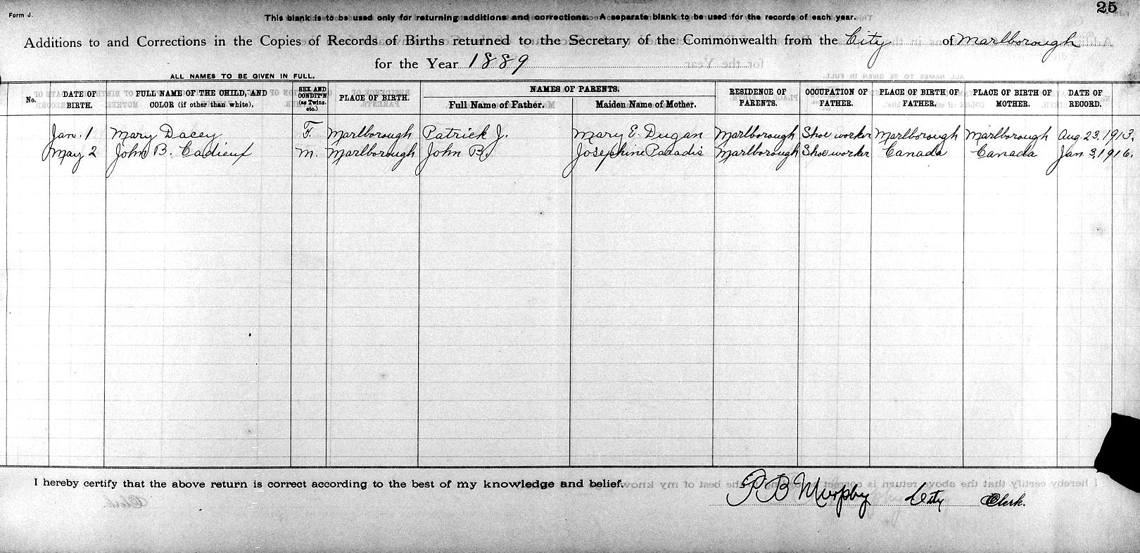 Birth Born on May 02, 1889 in Marlborough, Middlesex Co., MA Death Died on February 12, 1972 in Worcester, Worcester Co., MA Buried in Maplewood Cemetery in Marlborough, Middlesex Co., MA Marriages CASSIDY, Kathleen Barbara Married on April 07, 1923 in Cambridge, Middlesex Co., MA Children CADIEUX, Marion E.: May 30, 1925 - April 15, 2019 Notes Occupation: Accountant/ Music Teacher Sources Massachusetts Deaths: #7839 Images John Cadieux Birth John & Kathleen (Cassidy) Cadieux,Marion (Cadieux) Sivret Kathleen (Cassidy) Henderson Marriage