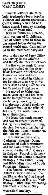 Birth Born on June 30, 1915 in Haileybury, Timiskaming District, ON Death Died on June 05, 1971 in Whitehorse, YT Buried in Grey Mountain Cemetery in Whitehorse, YT Marriages FOWLER, Leona Elizabeth Married on November 20, 1948 in Vancouver, Metro Vancouver Region, BC Children CAMLEY, Donna - 1997 CAMLEY, Donald Notes Occupation: Mariner/ Cook/ Dispatcher Canadian Freightways/ White Pass Transport Death: Heart Attack Military Service: WW2 Merchant Marine Petty Officer Sources Findagrave.com: https://www.findagrave.com/memorial/51720285/dalton-joseph-camley Images Dalton Camley Leona Fowler Marriage Dalton Camley Obit