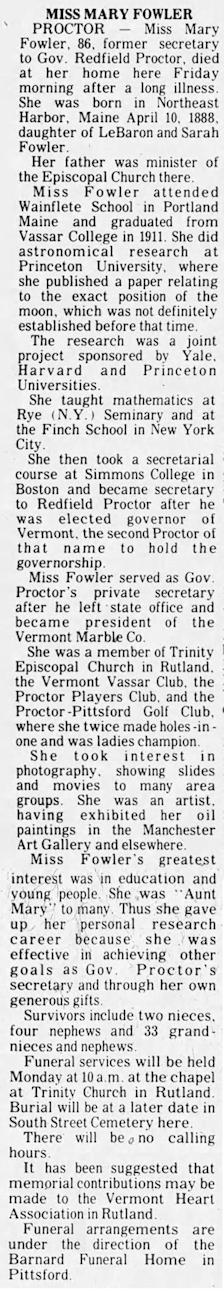 Parents Father: FOWLER, LeBaron Wilford Mother: FOWLER, Sarah Ann Birth Born on April 10, 1888 in Mount Desert, Hancock Co., ME Death Died on April 12, 1974 in Proctor, Rutland Co., VT Buried in South Street Cemetery in Proctor, Rutland Co., VT Notes Death: Congestive Heart Failure Occupation: Astronomical Research/ Math Teacher/ Secretary for Governor of Vermont/ Private Secretary President of Vermont Marble Co. Sources Vermont Deaths: #1220 Images Mary Fowler Border Crossing Mary E. Fowler Obit The Rutland Daily Herald Rutland,VT Apr 13,1974 Mary Fowler Mary Fowler Death Mary E. Fowler Obit The Rutland Daily Herald Rutland,VT Apr 13,1974