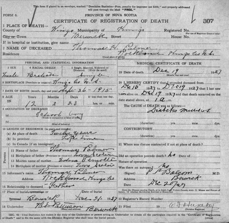 Parents Father: PALMER, Thomas Mother: VEINOT, Edna Birth Born on September 26, 1915 in Rockland, Kings Co., NS Death Died on December 19, 1927 in Berwick, Kings Co., NS Buried in Berwick Cemetery in Berwick, Kings Co., NS Notes Occupation: Diabetes Mellitis Sources Nova Scotia Deaths: Book 126 Pg. 307 Images Thomas H. Palmer Birth Thomas H. Palmer Death