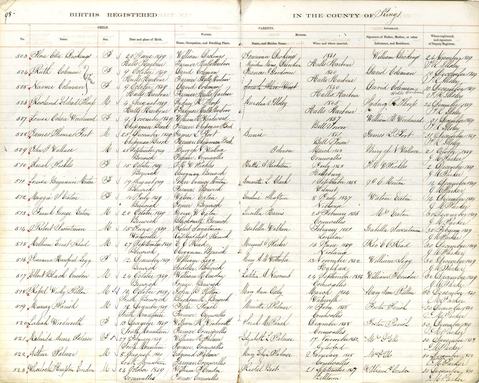 Parents Father: PALMER, Edmund Chute Mother: PALMER, Mary Eliza Birth Born on August 08, 1869 in South Mountain, Kings Co., NS Death Died on July 22, 1946 in Berwick, Kings Co., NS Buried in Berwick Cemetery in Berwick, Kings Co., NS Marriages BORDEN, Rachel Ann Married on January 13, 1892 in Kentville, Kings Co., NS Children PALMER, George E.: December 09, 1896 - October 31, 1931 PALMER, Greta Delia: March 16, 1898 - 1988 PALMER, Fred: February 16, 1900 PALMER, Alice Marie: April 23, 1904 - June 16, 1963 Notes Occupation: Farmer Death: Cardio Muscular Renal Disease Sources Nova Scotia Deaths: Year 1946 Pg. 4999 Images James Palmer Birth George Palmer,James & Rachel (Borden) Palmer James Palmer Death James Palmer Marriage