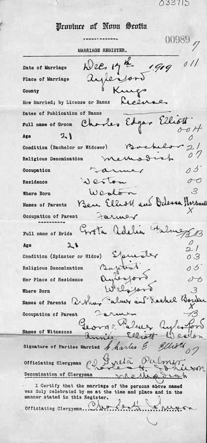Birth Born on May 10, 1898 in Weston, Kings Co., NS Death Died on April 28, 1973 in Weston, Kings Co., NS Buried in Aylesford Union Cemetery in Aylesford, Kings Co., NS Marriages PALMER, Greta Delia Married on December 17, 1919 in Aylesford, Kings Co., NS Children ELLIOTT, George Benjamin: March 30, 1924 - July 16, 1996 ELLIOTT, Geraldine Maurie: 1935 - September 12, 2025 Notes Occupation: Farmer Death: Myocardial Infarction Sources Nova Scotia Deaths: Year 1973 #3798 Images Charles & Greta (Palmer) Elliott Charles Elliott Death Greta Palmer Marriage