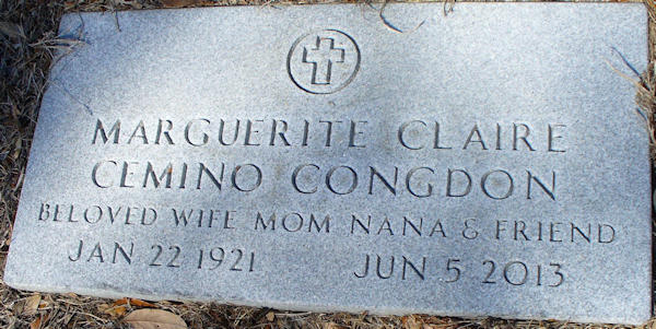 Birth Born on January 22, 1921 in North Plainfield, Somerset Co., NJ Death Died on June 05, 2013 in Haines City, Polk Co., FL Buried in Forest Hill Cemetery in Haines City, Polk Co., FL Marriages CONGDON, Frank Sterling Children CONGDON, Judith: 1949 CONGDON, Robert Sterling: September 15, 1952 Images Marguerite (Cemino) Congdon