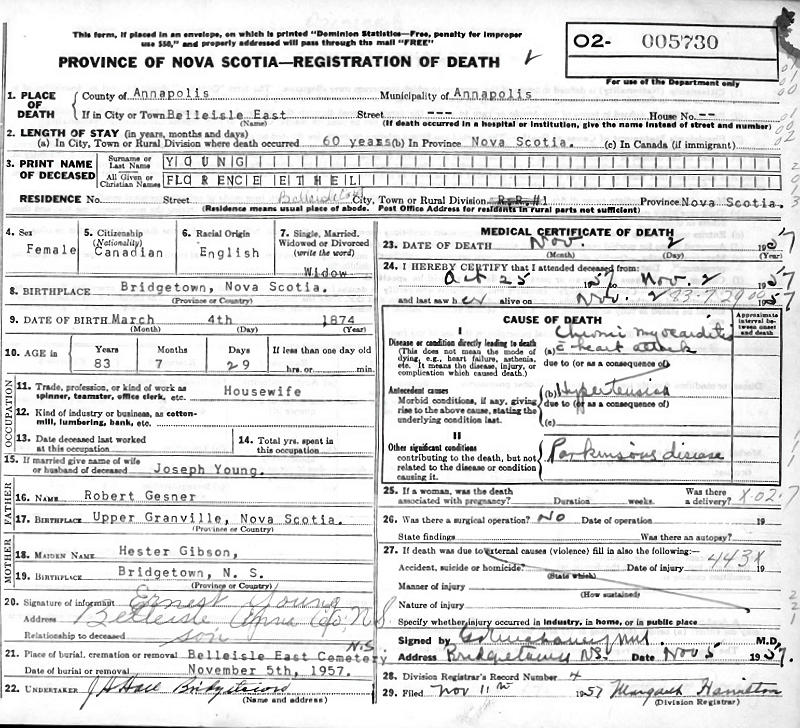 Birth Born on March 04, 1874 in Belleisle, Annapolis Co., NS Death Died on November 02, 1957 in Belleisle, Annapolis Co., NS Buried in Gesner Cemetery in Belleisle, Annapolis Co., NS Marriages YOUNG, Joseph Henry Married on October 28, 1893 in Bridgetown, Annapolis Co., NS Children YOUNG, Florence Etta: July 29, 1904 - December 10, 1973 Notes Death: Chronic Myocarditis/ Heart Attack Sources Annapolis Cemetery Records: Gesner Cemetery Belleisle,NS #20 Nova Scotia Deaths: Year 1957 Pg. 5730 Images Joseph & Florence (Gesner) Young Florence (Gesner) Young Death Joseph Young Marriage
