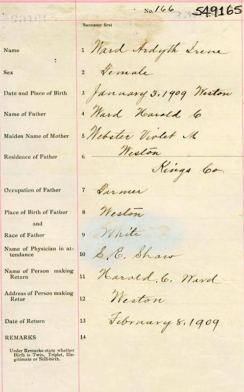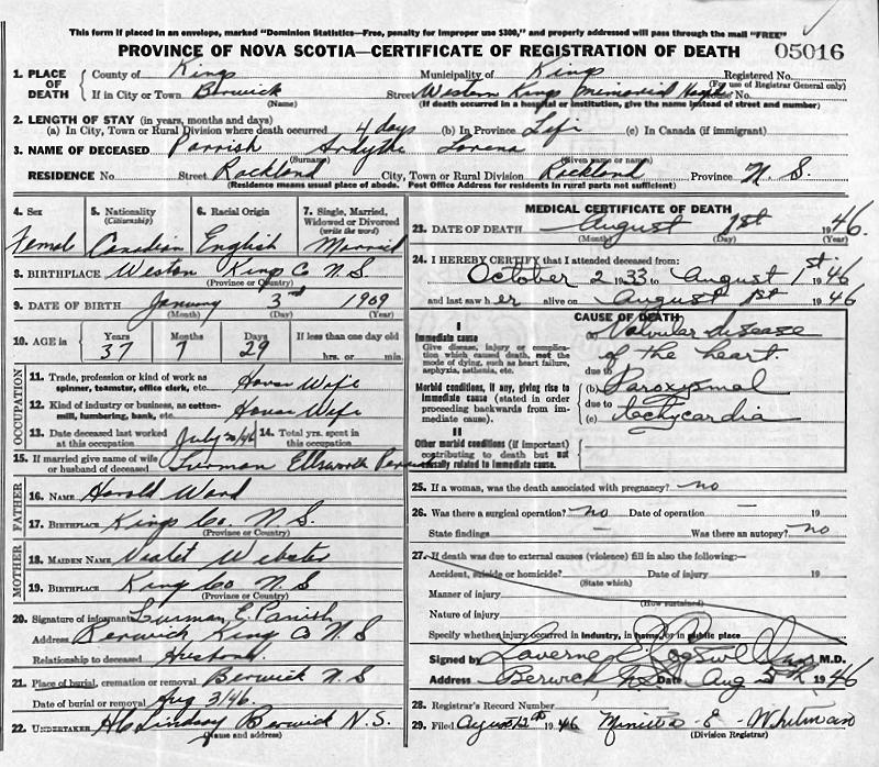 Parents Father: WARD, Harold Clark Mother: WEBSTER, Violet Mary Birth Born on January 03, 1909 in Berwick, Kings Co., NS Death Died on August 01, 1946 in Berwick, Kings Co., NS Buried in Berwick Cemetery in Berwick, Kings Co., NS Marriages PARRISH, Lurman Ellsworth Married on June 03, 1931 in Berwick, Kings Co., NS Notes Death: Valvular Heart Disease Sources Nova Scotia Deaths: Year 1946 Pg. 5016 Images Ardyth Ward Birth Ardyth (Ward) Parrish Death Lurman Parrish Marriage
