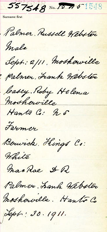Parents Father: PALMER, Frank Webster Mother: CASEY, Ruby Helena Birth Born on September 02, 1911 in Mosherville, Hants Co., NS Death Died on 1978 in Hants Co., NS Buried in Saint Stephen's Anglican Church Cemetery in Stanley, Hants Co., NS Marriages WARNER, Hilda Rebecca Married on July 17, 1946 in North Kingston, Kings Co., NS Children PALMER, Joy Notes Occupation: Lumberman Sources Hants Cemeteries: Saint Stephen's Anglican Church Cemetery Stanley,NS Images Russell Palmer Birth Russell & Hilda (Warner) Palmer Russell Palmer Marriage