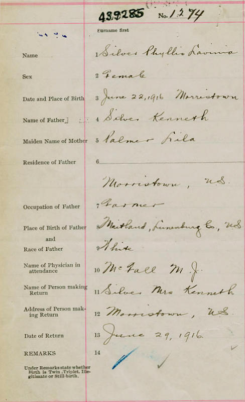 Parents Father: SILVER, Kenneth Nathan Mother: PALMER, Lila Mae Birth Born on June 22, 1916 in Morristown, Kings Co., NS Death Died on May 15, 2005 in Kentville, Kings Co., NS Buried in Berwick Cemetery in Berwick, Kings Co., NS Marriages CORKUM, Ralph Clyde Married on November 22, 1932 in Berwick, Kings Co., NS Children CORKUM, Aubrey CORKUM, Thomas CORKUM, George CORKUM, Gerald CORKUM, Grace CORKUM, Gertrude CORKUM, Betty CORKUM, Myrtle Sharron CORKUM, Marie CORKUM, Christina CORKUM, Gyneth CORKUM, Hartley Keith: 1939 - May 07, 2010 CORKUM, David John: November 09, 1946 - August 18, 1960 Notes Obituary: CORKUM, Phyllis Lavinia - 88, Berwick, Kings Co., passed away May 15, 2005, in Valley Regional Hospital, Kentville. Born in Morristown, Kings Co., she was a daughter of the late Kenneth and Lila (Palmer) Silver. Surviving are her sons, Hartley (Muriel) Corkum, Berwick; Aubrey (Carolyn) Corkum, Tom (Ruth) Corkum, George (Heather) Corkum, all of Windermere; Gerald (Jackie) Corkum, South Berwick; daughters, Grace Murphy, Truro; Gertrude (Lloyd) Smith, Berwick; Betty (Edwin) McIntyre and Myrtle Allen, both of Upper Gagetown, N.B.; Marie (Wendell) Smith, Swan Creek, N.B.; Christina Corkum, Kentville; 27 grandchildren; 34 great-grandchildren; one great great-granddaughter; brother, Mylon (Dorothy) Silver, Fredericton, N.B.; sister, Gladys (Robert) Connors, Rockland. Besides her parents, she was predeceased by her husband, Ralph C. Corkum; son, David Corkum; daughter, Gyneth Corkum; grandchildren, John Paynter, Cheryl Lee McIntyre; brothers, Kenneth Silver in infancy and Alvin Silver; sisters, Joan Silver in infancy and Olie Silver. Visitation will be held from 7-9 p.m. today with the funeral service at 2 p.m. Wednesday, both in H.C. Lindsay Memorial Chapel, 192 Commercial St., Berwick (902-538-9900), Rev. Murray Shaw officiating. Burial in Berwick Cemetery. Sources Funeral Home: H.C. Lindsay Funeral Home Berwick,NS Obituary May 2005 Images Phyllis Silver Birth Ralph & Phyllis (Silver) & David Corkum Phyllis Silver Marriage