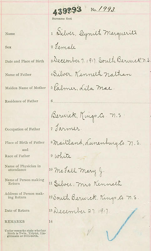 Parents Father: SILVER, Kenneth Nathan Mother: PALMER, Lila Mae Birth Born on December 07, 1917 in South Berwick, Kings Co., NS Death Died on March 25, 1997 in Berwick, Kings Co., NS Buried in Berwick, Kings Co., NS Marriages SILVER, Cecil Robert Married on April 16, 1938 in North River, Lunenburg Co., NS Children SILVER, Keith SILVER, Sherald Margaret: November 02, 1942 - September 04, 2008 Notes Obituary: SILVER, Gyneth Marguerite - 79, Rockland, Kings Co., passed away March 25, 1997, in Grand View Manor, Berwick. Born in South Berwick, she was a daughter of the late Kenneth Nathan and Lila Mae (Palmer) Silver. She was a graduate of Nova Scotia Normal College (1959) and taught for many years in Rockland and Somerset elementary schools. She was a charter member of Rockland Women's Institute. She was a member of Berwick United Church and for many years was a member of the choir. She enjoyed gardening and working in the family orchard. She is survived by her husband, Cecil Robert Silver, Rockland; daughter, Sherald and husband Reg Patterson, Berwick; son, Keith and wife Corinne, Rockland; sisters, Phyllis Corkum, Gladys (Mrs. Robert Connors), Rockland; brother, Mylon Silver, Fredericton, N.B.; grandchildren, Gary, Gina and Gwen Patterson, Melanie and John Silver. She was predeceased by brothers, Kenneth in infancy, Alvin Silver; sisters, Joan in infancy, Ollie Silver. Visitation will be 2-4, 7-9 p.m. Thursday, March 27, in H.C. Linday Memorial Chapel, 192 Commercial St., Berwick. Funeral service will be 3:30 p.m. Friday, March 28, in Berwick United Church, Rev. Donald C. MacPherson officiating. Burial in Berwick Cemetery. Donations may be made to Alzheimer Society of Nova Scotia; Grand View Manor, Berwick, or Berwick United Church. Occupation: Teacher Images Gynith Silver Birth Gyneth Silver Marriage