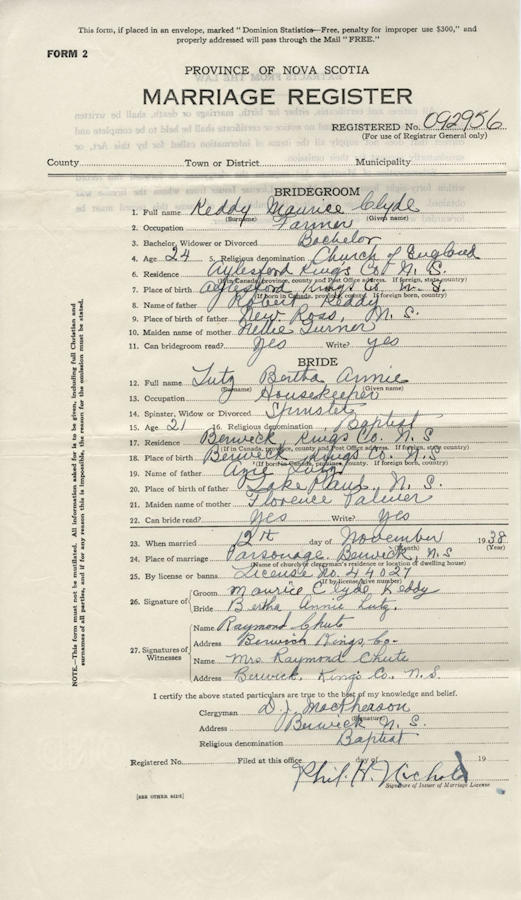 Parents Father: LUTZ, Azie Elvison Mother: PALMER, Florence Odessa Birth Born on July 21, 1917 in Rockland, Kings Co., NS Death Died on March 10, 2014 in Kentville, Kings Co., NS Buried in St. Mary's Anglican Church Cemetery in Auburn, Kings Co., NS Marriages KEDDY, Morris Clyde Married on November 12, 1938 in Berwick, Kings Co., NS Children KEDDY, Brian KEDDY, Stewart KEDDY, Jean: 1940 Notes Obituary: Bertha Annie Keddy - 96, of Aylesford, Kings County, passed away Monday, March 10, 2014 in the Valley Regional Hospital, Kentville. Born in Rockland, Kings County, she was a daughter of the late Azie and Florence (Palmer) Lutz. She worked on the family farm with her husband of 75 years. She had great pride in her children and especially her grandchildren. She was a very special and strong person who always put others before herself. There were very few jobs on the farm that she did not do. She was very active with her chores and hens until she was no longer able. She always appreciated all that was done for her by others and never hesitated to thank them. She is survived by her husband, Morris; she will also be deeply missed by her children, Brian (Linda), Aylesford; Jean Schofield, Bridgewater; Stewart (Beryl), Lower Sackville; grandchildren, Shawn, Jason, Mark, Scott, Charlene and Michael; two great grandchildren; six sisters, Bessie Stoddart, Helen Wilson, Marie Carver, Janice Dunn, Carolyn Schrage and Marina Hudson; four brothers, Carleton Lutz, Hardy Lutz, Ronnie Lutz and Robert Lutz. She was predeceased by four sisters, Carrie Carver, Doris Palmer, Margaret Palmer and Rose Boyd; a brother, Whitney Lutz; son-in-law, Gerald Schofield. Visitation will be held from 7-9 p.m. Friday, March 14, 2014 in Christ Anglican Church Hall, Berwick. The funeral service, followed by a reception, will be held at 2:00 p.m. Saturday, March 15, 2014 in Christ Anglican Church, Berwick, Reverend Ruby Carter officiating. A private family burial will take place in the Auburn Cemetery. Family flowers only, by request. Donations in memory may be made to the charity of your choice. The family wishes to express our sincere thanks to the V.O.N. Continuing Care Home Care, the staff of the Valley Regional Hospital, Dr. Dickson, Dr. George, the Red Cross and all those who visited, brought food and helped in any way. We are deeply grateful. Funeral arrangements have been entrusted to the White Family Funeral Home and Cremation Services, Kentville. Sources Funeral Home: White Family Funeral Home Kentville,NS Obituary March 2014 Images Bertha Lutz Birth Morris & Bertha (Lutz) Keddy Bertha Lutz Marriage Bertha Lutz