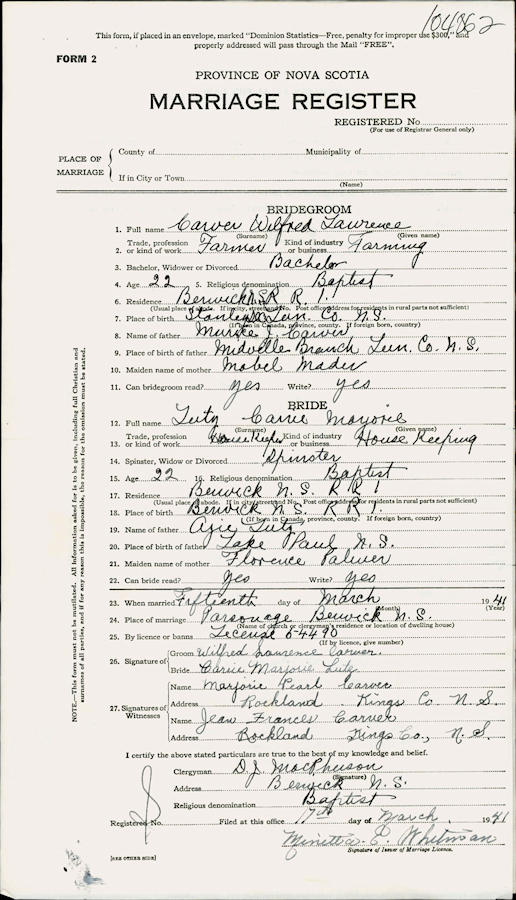 Parents Father: LUTZ, Azie Elvison Mother: PALMER, Florence Odessa Birth Born on January 24, 1919 in Rockland, Kings Co., NS Death Died on 2006 in Kings Co., NS Buried in Morristown Cemetery in Morristown, Kings Co., NS Marriages CARVER, Wilfred Laurence Married on March 15, 1941 in Berwick, Kings Co., NS Children CARVER, Diane CARVER, Glendon W.: 1941 Sources Kings Cemetery Records: Morristown Cemetery Morristown,NS Images Carrie Lutz Birth Wilfred & Carrie (Lutz) Carver Carrie Lutz Marriage