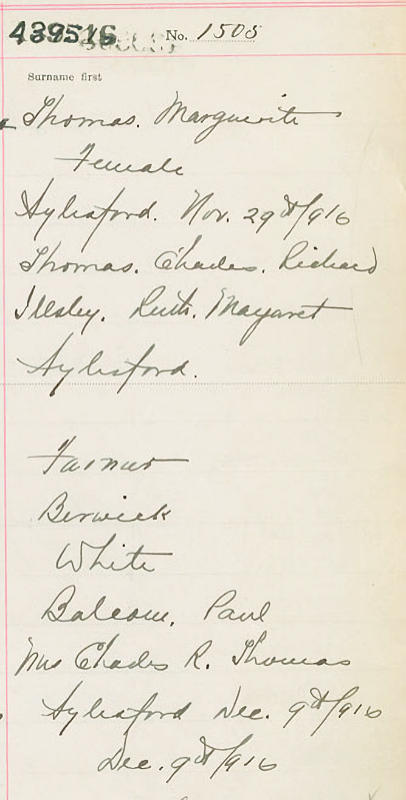 Parents Father: THOMAS, Charles Richard Mother: ILLSLEY, Ruth Margaret Birth Born on November 29, 1916 in Aylesford, Kings Co., NS Marriages GRAHAM, William David Married on July 10, 1944 in Aylesford, Kings Co., NS Notes Occupation: Registered Nurse Images Marguerite Thomas Birth Marguerite Thomas Marriage