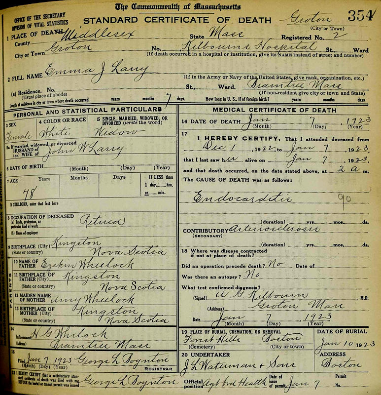 Parents Father: WHEELOCK, Ezekiel Cleveland Mother: DODGE, Amy Elizabeth Birth Born on September 21, 1844 in Kingston, Kings Co., NS Death Died on January 07, 1923 in Groton, Middlesex Co., MA Buried in Forest Hills Cemetery in Boston, Suffolk Co., MA Marriages LARRY, John Wallace Married on September 26, 1869 in Boston, Suffolk Co., MA Children LARRY, Charles Wheelock: November 07, 1872 - August 29, 1958 LARRY, Edna Wheelock: April 23, 1874 - August 05, 1888 LARRY, Genevieve Howard: February 24, 1878 LARRY, Howard: 1887 - May 31, 1897 Notes Occupation: Seamstress Death: Endocarditis Sources Massachusetts Deaths: Groton Pg. 354 #2 Images Emma (Wheelock) Larry Death