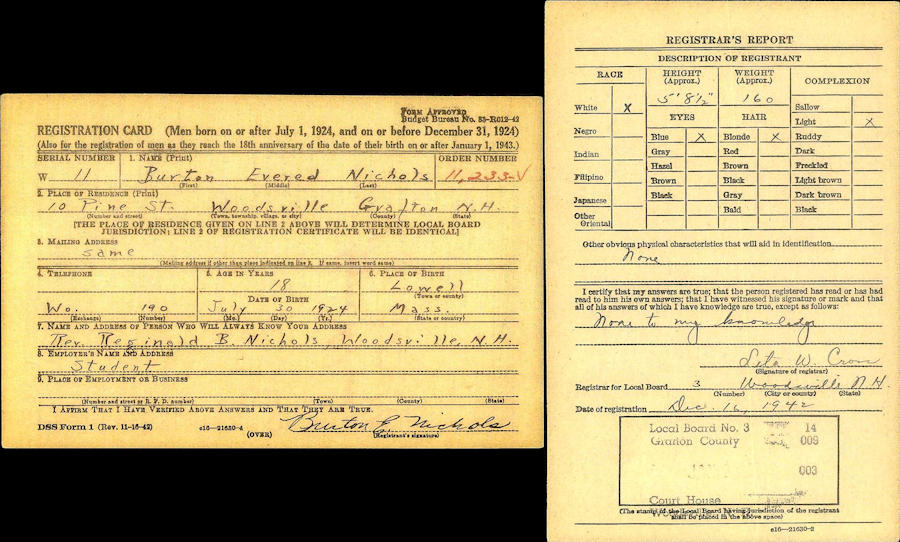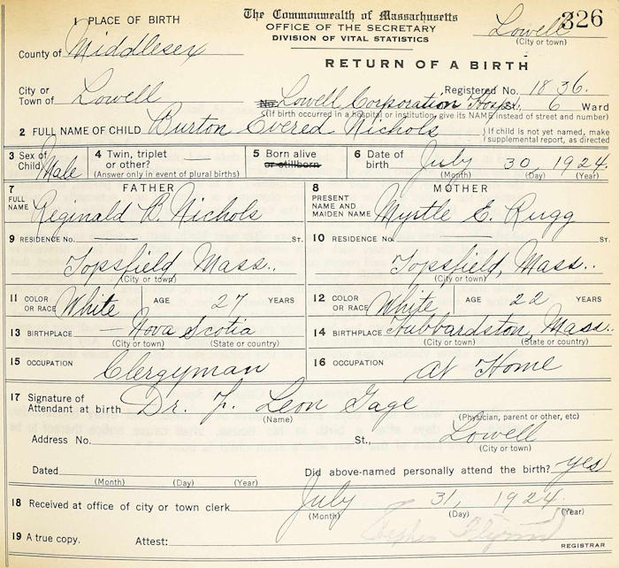 Parents Father: NICHOLS, Reginald Burton Mother: RUGG, Myrtle Evelyn Birth Born on July 30, 1924 in Lowell, Middlesex Co., MA Marriages CASHWELL, Marjorie Hazel (Pingree) Married on November 10, 1956 in Haverhill, Grafton Co., NH Notes Occupation: Advertising Images Burton Nichols Birth Burton Nichols WW2 Draft Burton Nichols Marriage