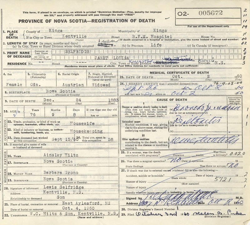 Birth Born on December 24, 1883 in Coldbrook, Kings Co., NS Death Died on October 02, 1960 in Kentville, Kings Co., NS Buried in Aylesford Union Cemetery in Aylesford, Kings Co., NS Marriages SELFRIDGE, Arthur Lewis Married on June 02, 1909 in Kentville, Kings Co., NS Children SELFRIDGE, George Lewis: March 28, 1910 - 1994 Notes Death: Broncho Pneumonia Sources Nova Scotia Deaths: Year 1960 Pg. 5672 Images Janet (Hiltz) Selfridge Janet (Hiltz) Selfridge Death Arthur Selfridge Marriage