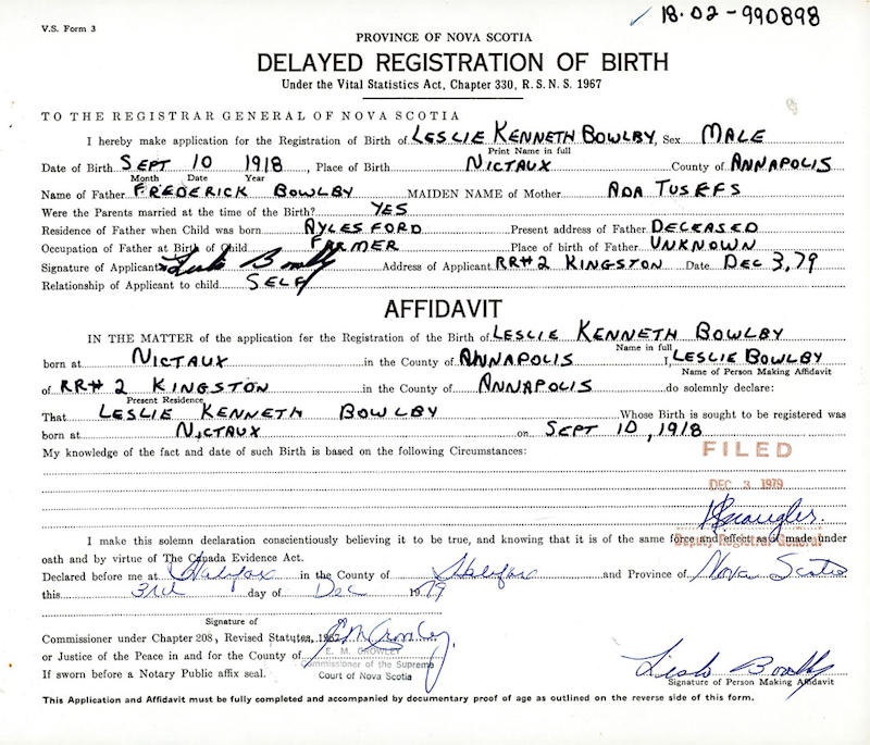 Parents Father: BOWLBY, Frederick Chipman Mother: TUFTS, Ada Louise Birth Born on September 10, 1918 in Nictaux, Annapolis Co., NS Death Died on January 27, 1989 in Auburn, Kings Co., NS Buried in Aylesford Union Cemetery in Aylesford, Kings Co., NS Marriages CROCKER, Lena Frances Irene Married on November 22, 1939 in Berwick, Kings Co., NS LIVELY, Eileen M. Children BOWLBY, Jeanette BOWLBY, Carmen BOWLBY, Louise BOWLBY, Diane BOWLBY, Wayne BOWLBY, Leslie BOWLBY, Laurie BOWLBY, Beverley Mae: 1941 - 1978 Notes Occupation: Farmer Sources Newspaper Obituary: Obituary January 1989 Images Leslie Bowlby Birth Leslie & Eileen Bowlby Leslie Bowlby Marriage