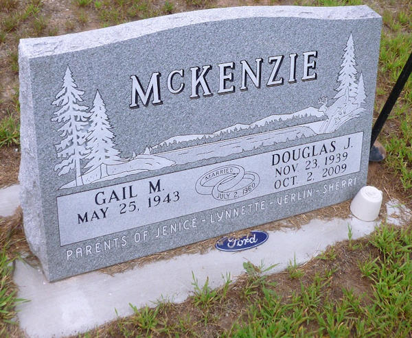 Parents Father: McKENZIE, Wayne Andrew Mother: BURNS, Mary Myra Birth Born on November 23, 1939 in Balsam Lake, Polk Co., WI Death Died on October 02, 2009 in Polk Co., WI Buried in Wolf Creek Cemetery in Wolf Creek, Polk Co., WI Marriages , Gail M. Children McKENZIE, Jenice McKENZIE, Lynnette McKENZIE, Verlin McKENZIE, Sherri Images Douglas & Gail McKenzie